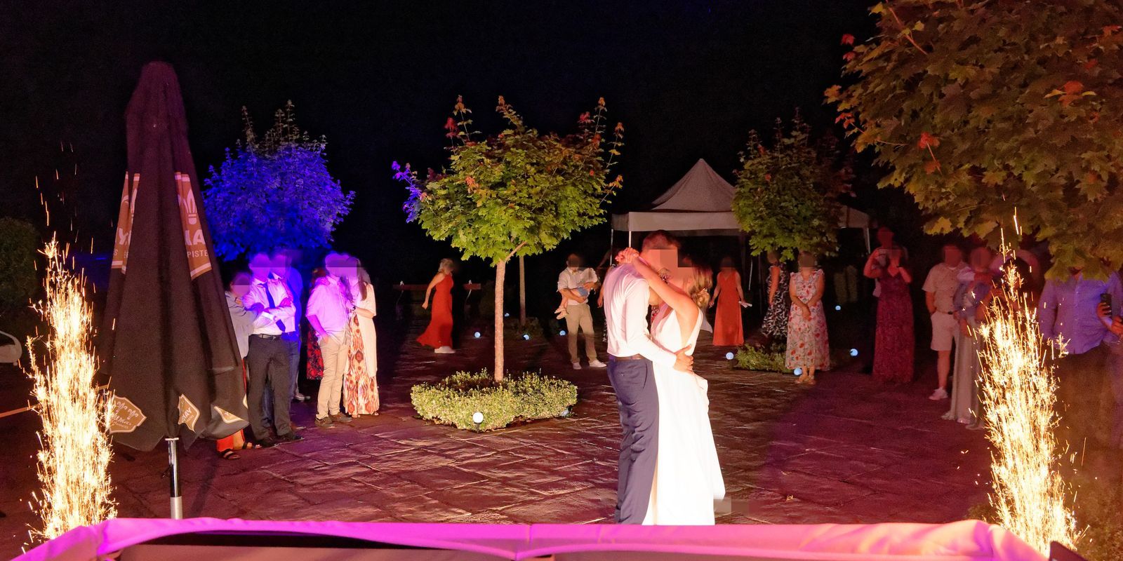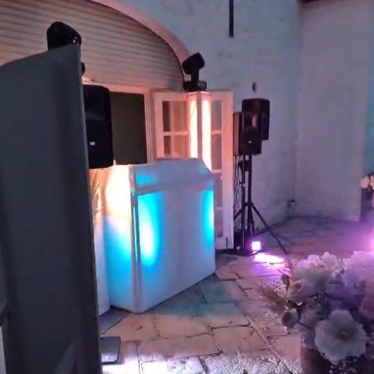 Au cours de la journée, nous avons sonorisé le mariage laïque dans le jardin, installé 4 uplighters sur batterie dans la salle principale ainsi que notre Demi-TotemPack pour la piste de danse avant de déplacer le tout dehors.